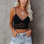 •Comes in a stretchy lace fabrication with scalloped edges, adjustable straps